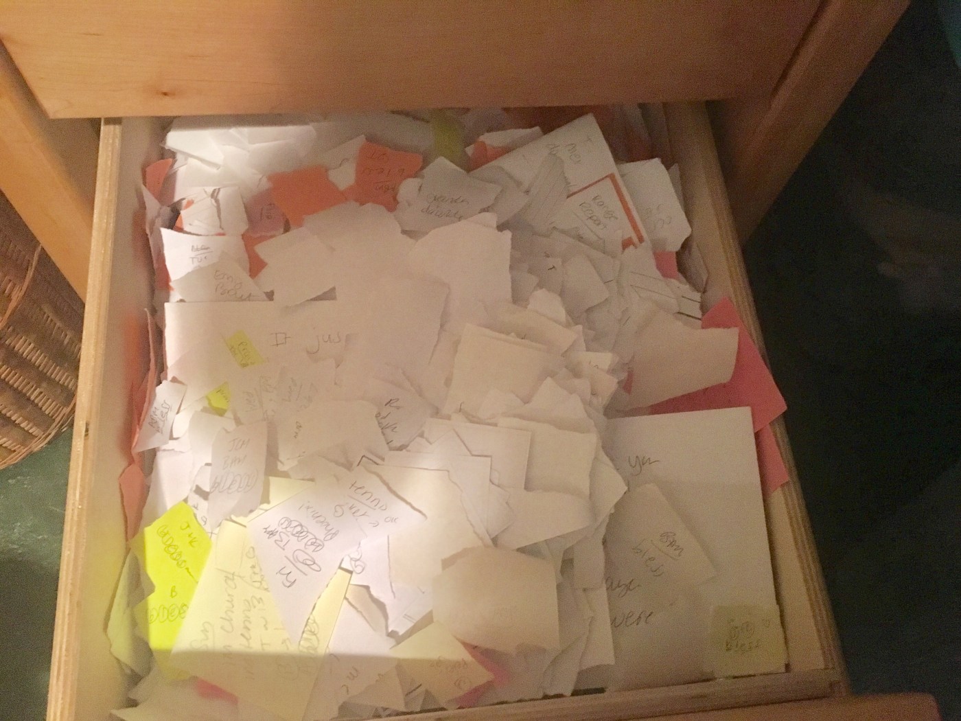 My scraps go from a small box to a desk drawer – a visual confirmation that my cup runneth over.